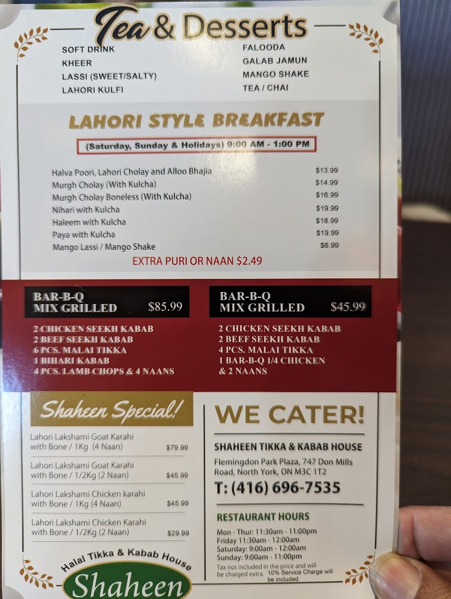 Shaheen Tikka & Kabab House, where each dish is a celebration of authentic Pakistani cuisine! Located at 747 Don Mills Rd., North York, our menu is brimming with delightful specialties that promise to tantalize your taste buds. Indulge in our Halwa Poori Platter with freshly baked Naan, or savor the rich flavors of our Pakistani Chicken Seekh and Keema Naan, each crafted with care in our tandoor. Don’t miss our standout offerings like Chicken Kabab, Lamb Rogan Josh, and the luscious Butter Chicken Masala. For something unique, try the Brain Masala or the Special Karahi Chicken that truly captures the essence of home-cooked delights. And for the perfect finishing touch, enjoy a sweet Lassi or a refreshing Chai to complement your meal. Whether you’re in the mood for a hearty dish or a light salad, Shaheen Tikka & Kabab House has something for everyone. Come and experience the taste of tradition today!